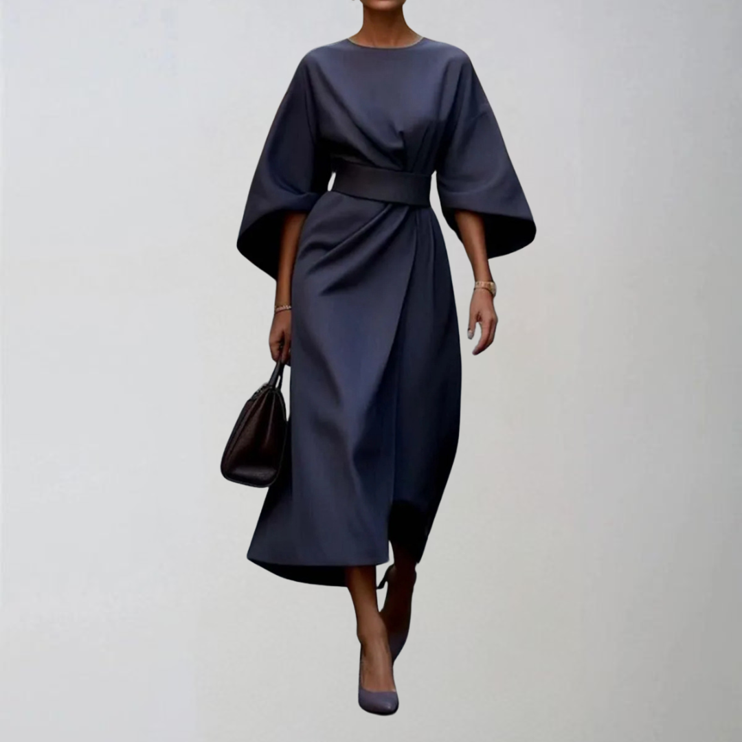 Sukienka Lucie łączy stylowy design z maksymalnym komfortem. Dzięki wyrazistym długim rękawom i paskowi, który pięknie podkreśla talię, ta sukienka jest idealna na każdą okazję – od formalnych kolacji po uroczyste wieczory.
